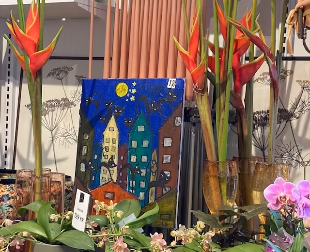 Med sina mått på 39 x 49 cm, är konstverket både tilltalande och imponerande utan att vara överväldigande. Canvasduken blir en scen för en samling glada djurfigurer som förenas genom Lisbeths lekfulla och färgglada estetik.