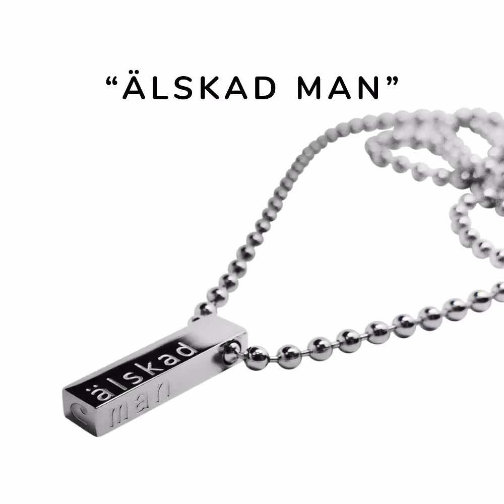 Halsbandet är i rostfritt stål och är graverad med texten Älskad man.