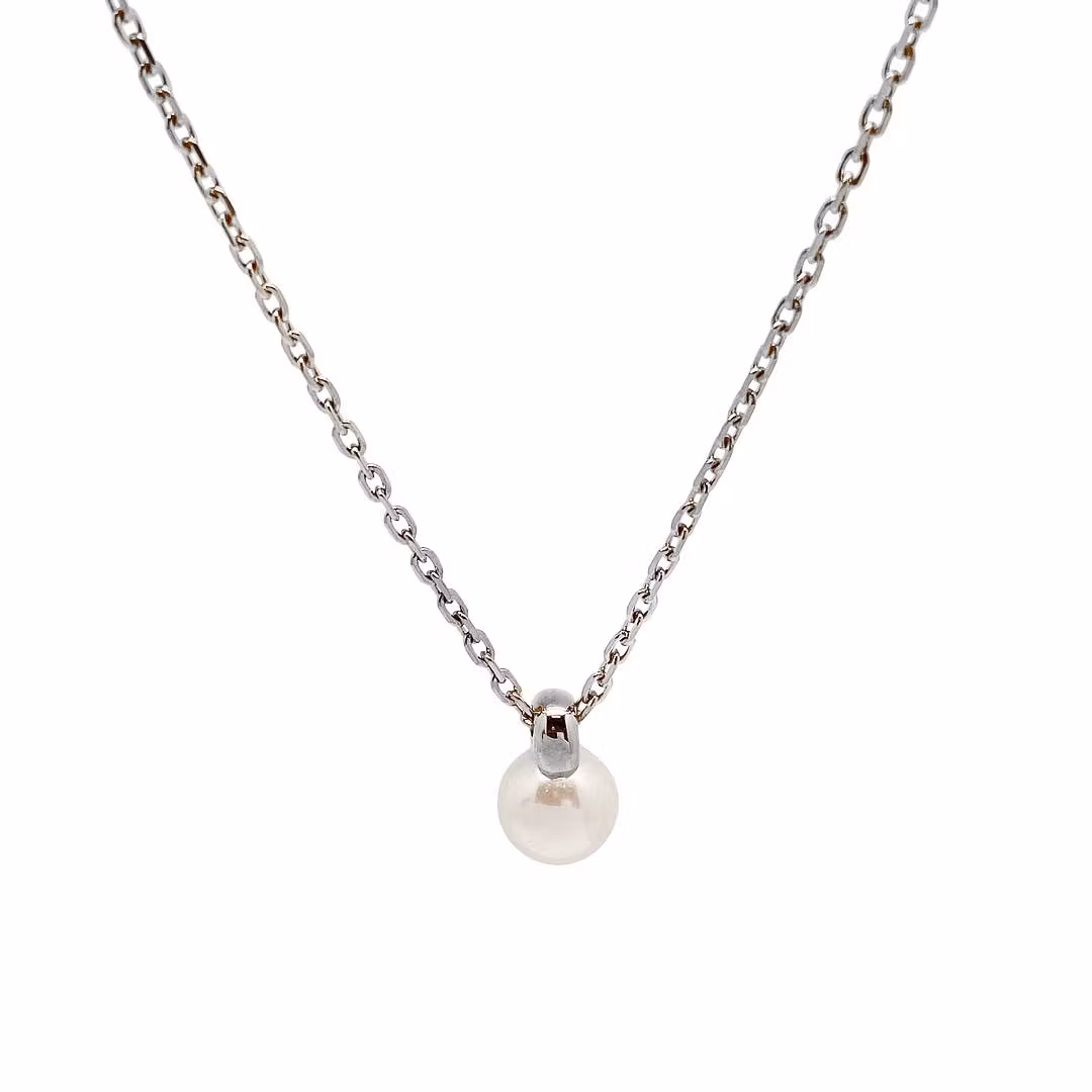 Vackert nätt kort halsband stål med en vit sötvattenpärla.