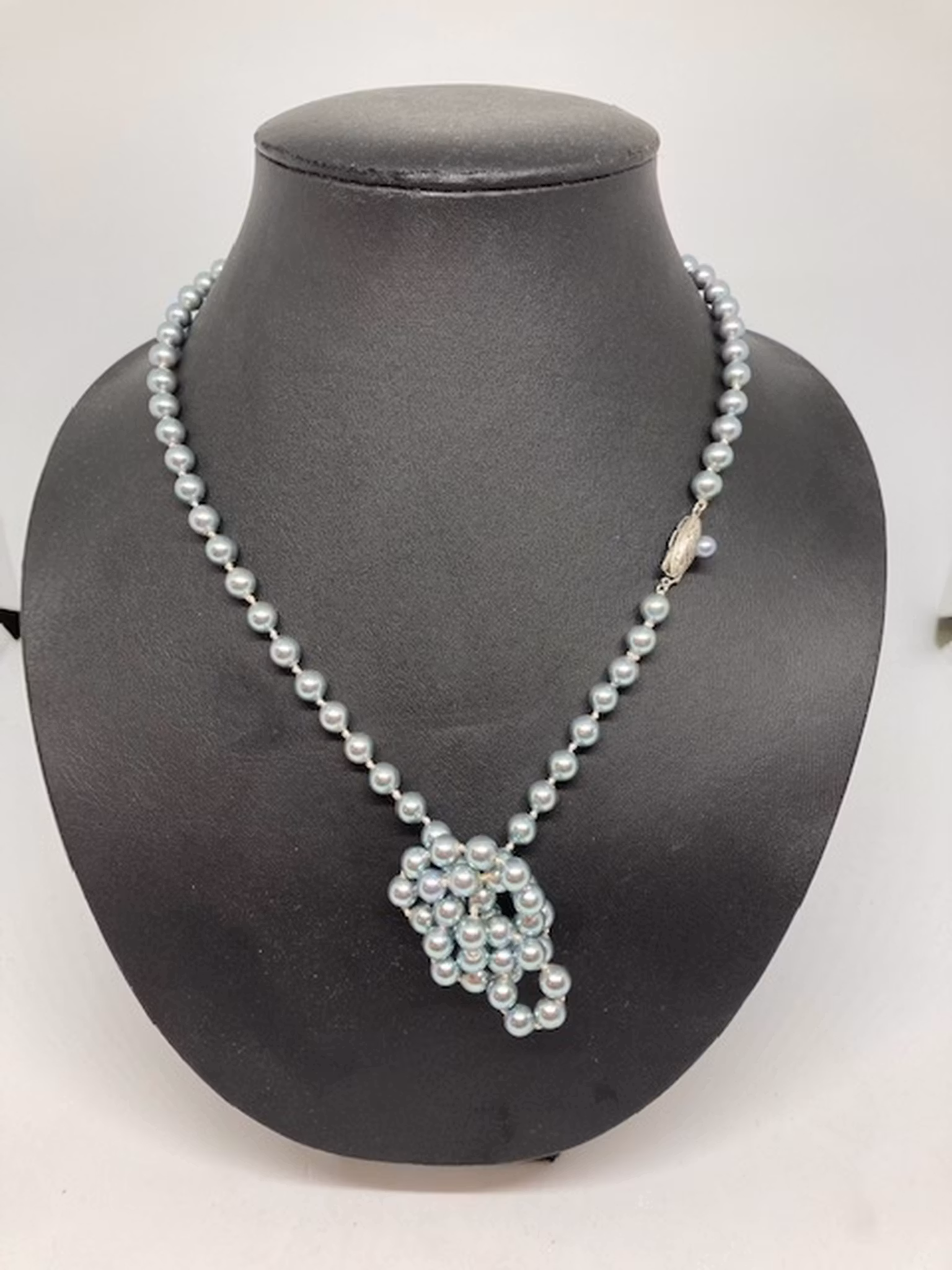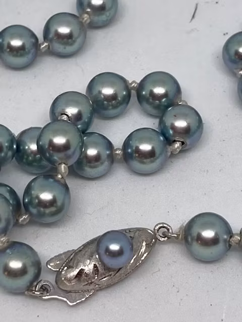 Elegant långt sötvatten pärlhalsband i en grå blå ton.