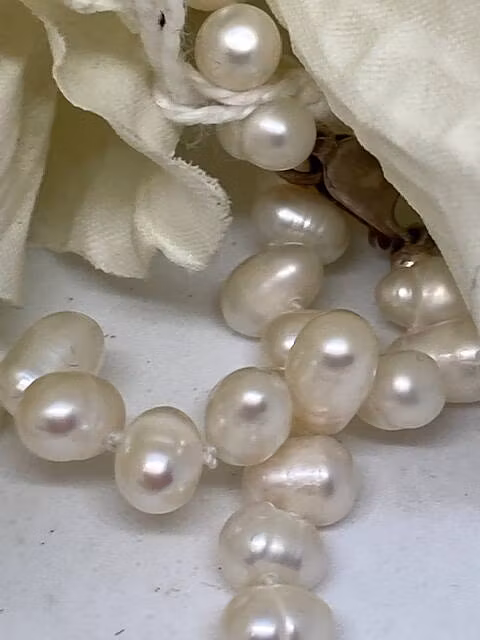 Halsbandet är trätt på pärlsilke med knutar emellan pärlorna och har ett silverlås