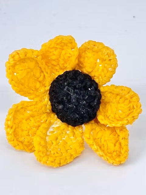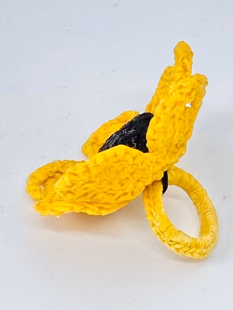 Ringen är handgjord och är virkad i gult acrylgarn med en svart knappdekor