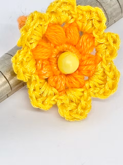 Gul/orange handgjord virkad ring.