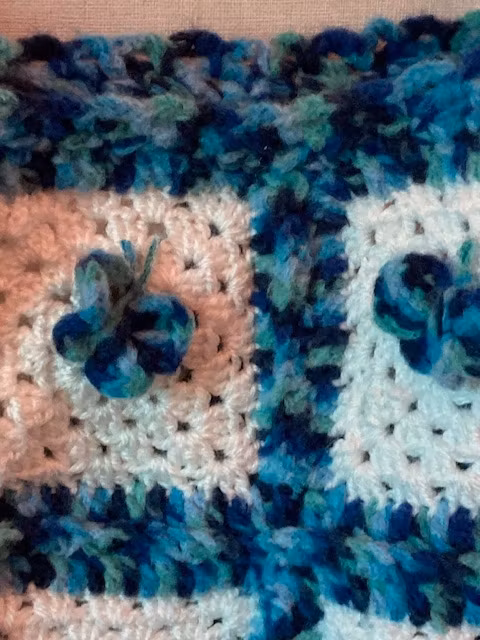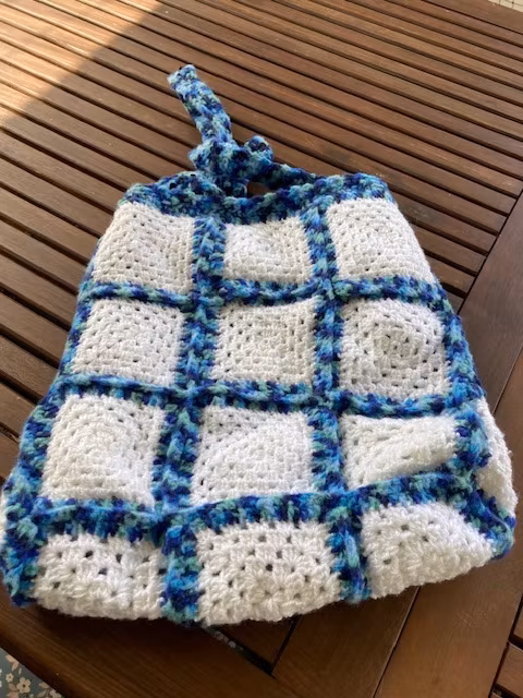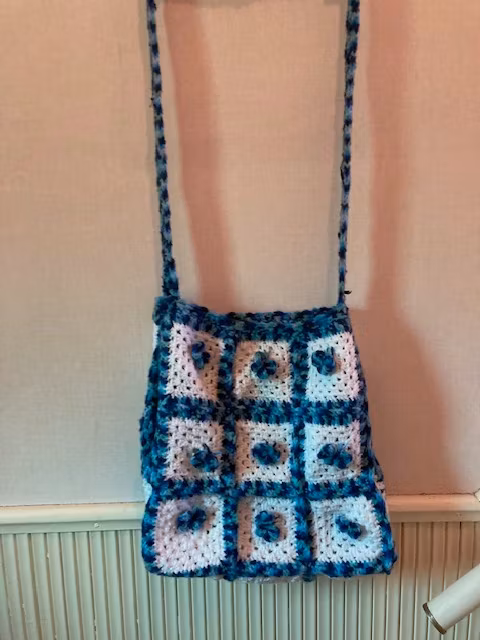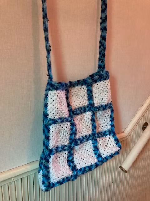 Väskan är virkad av vita momorsrutor och har små söta blå fjärilar som dekor på varje ruta.