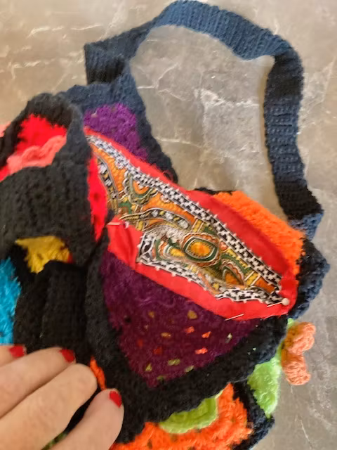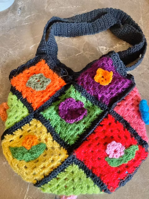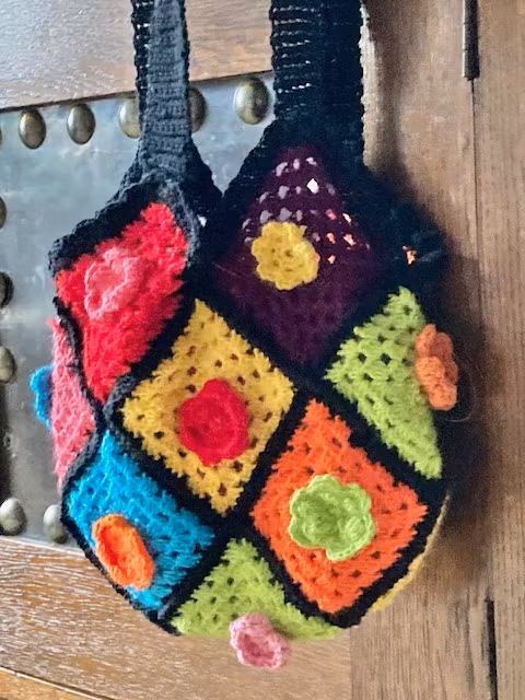 Denna trendiga väska är handgjord och virkad av färgglada momorsrutor, dekorerad med handgjorda virkade rosor i läckra färger.