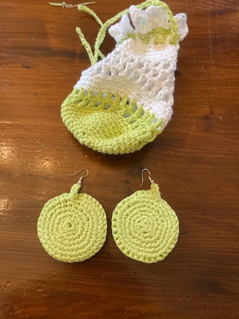 Handgjorda virkade grön örhängen med fin liten virkad smyckespåse.