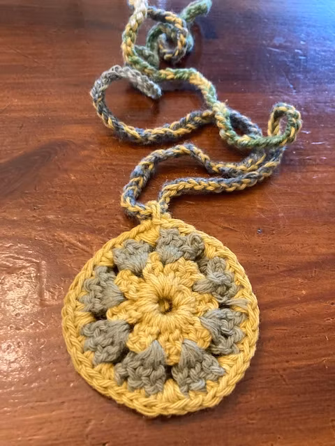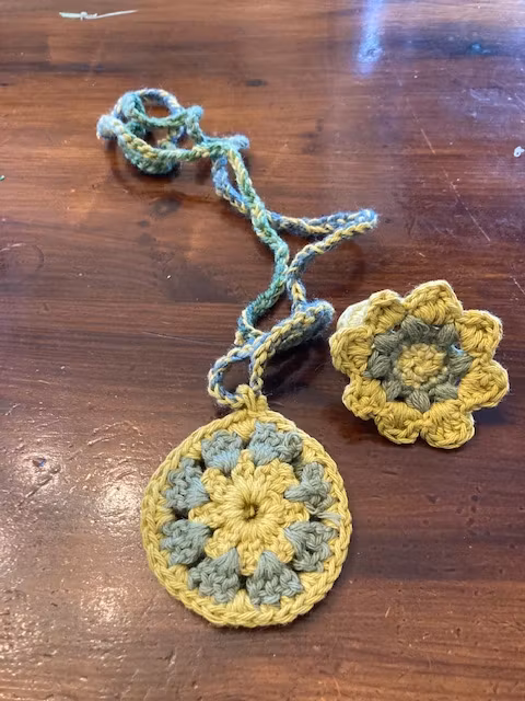 Ringen och halsbandet är virkat i grön och Gult bomullsgarn. eco- ringen har en mässingsring invirkad som stöd.