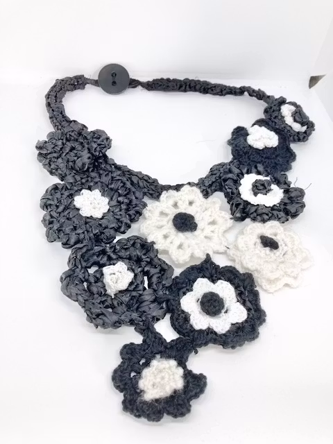 Handgjort virkat svart-vitt Blom-halsband