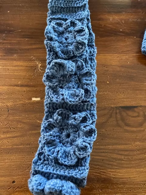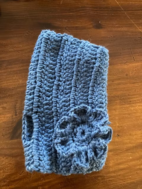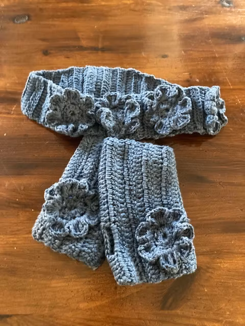 Handgjorda virkade handledsvärmare och pannband med blommor.