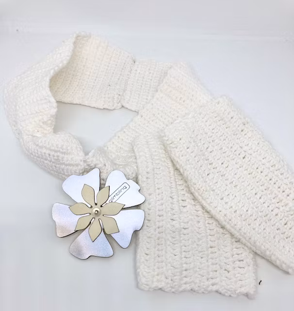 Matcha en snygg och säker reflexbrosch med vinter vita handvirkade accessoarer som handledsvärmare och ett värmande pannband. Presenttips-Julklappstips-Unna dig själv!