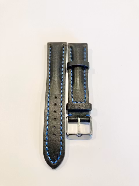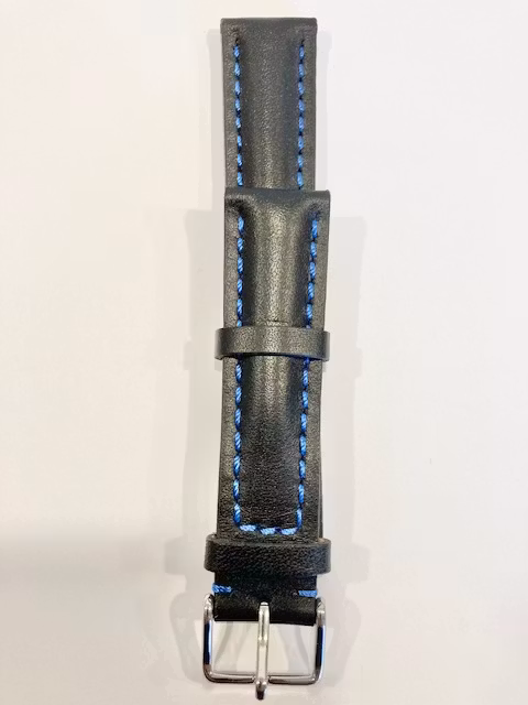 Fräckt klockarmband i äkta läder med blå stickningar.