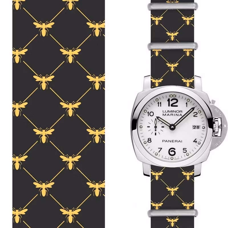 Klockarmband - Natoband mönster gula bin mot svart botten 298 SEK 149 SEK Produkten är tyvärr slut i lager. :( Natoband svart med mönster föreställande gult bi.Klockarmband i textil Färg svart med ett gult biBredd. 18 mm Flera populära produkter Jacob Mille Klockarmband - Natoband mönster ögon 149 SEK Jacob Mille Klockarmband Mönster Fiskar 149 SEK 249 SEK Klockarmband i rödfärgat äkta läder 100 SEK Klockarmband _ perlonband Paul Hewitt Färg rosa 100 SEK