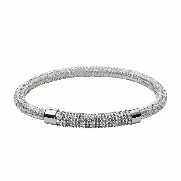 Snyggt armband i silverfärgat tyg smyckat med vita gnistrande zirkoner. Armbandet har ett magnetlås.