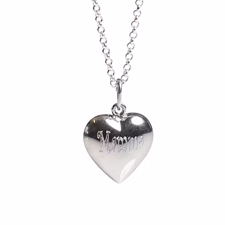 Silverhalsband med ett hjärta som är graverat med texten Mamma