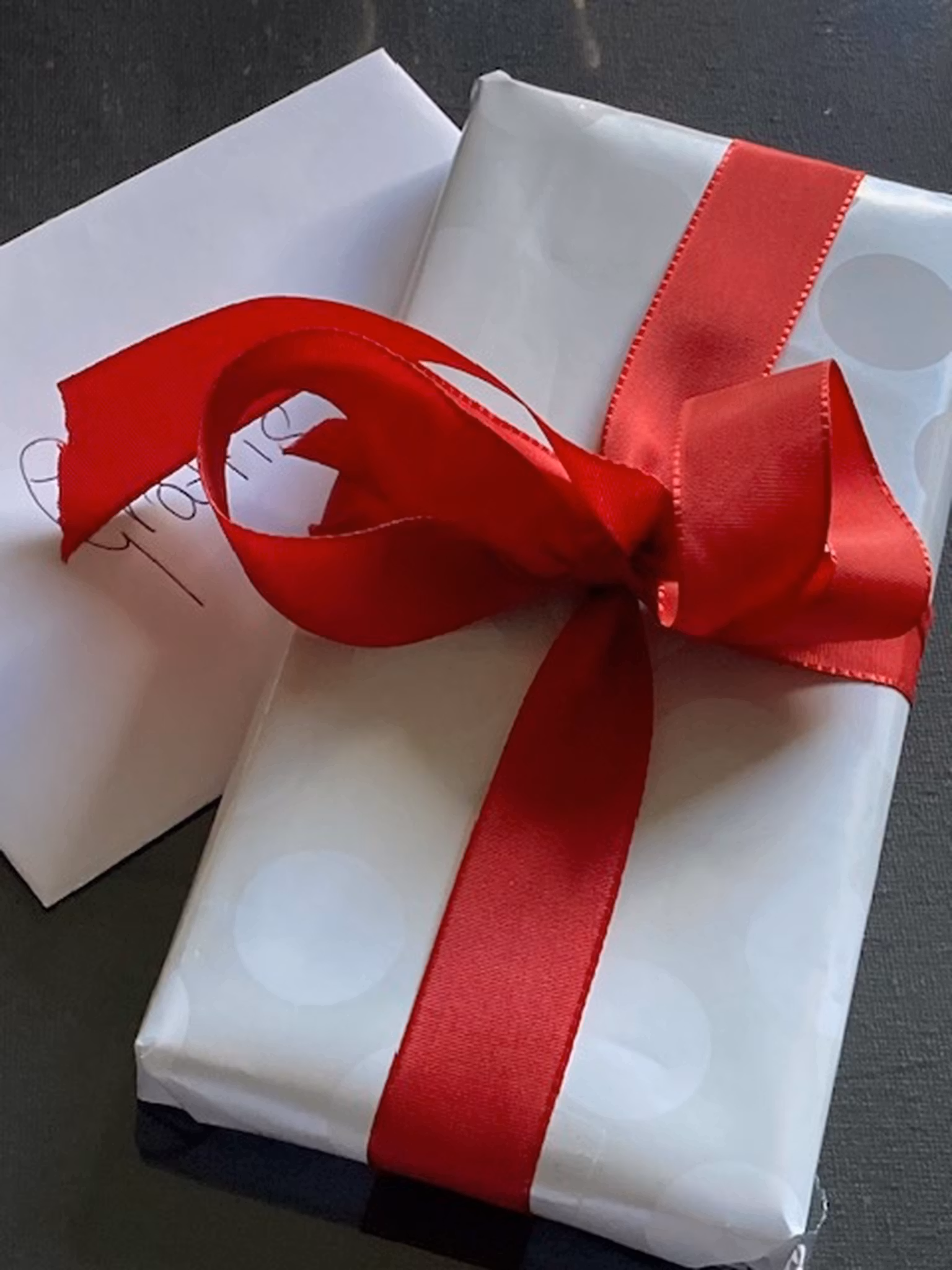 Paketinslagning med vitt glansigt papper rött band