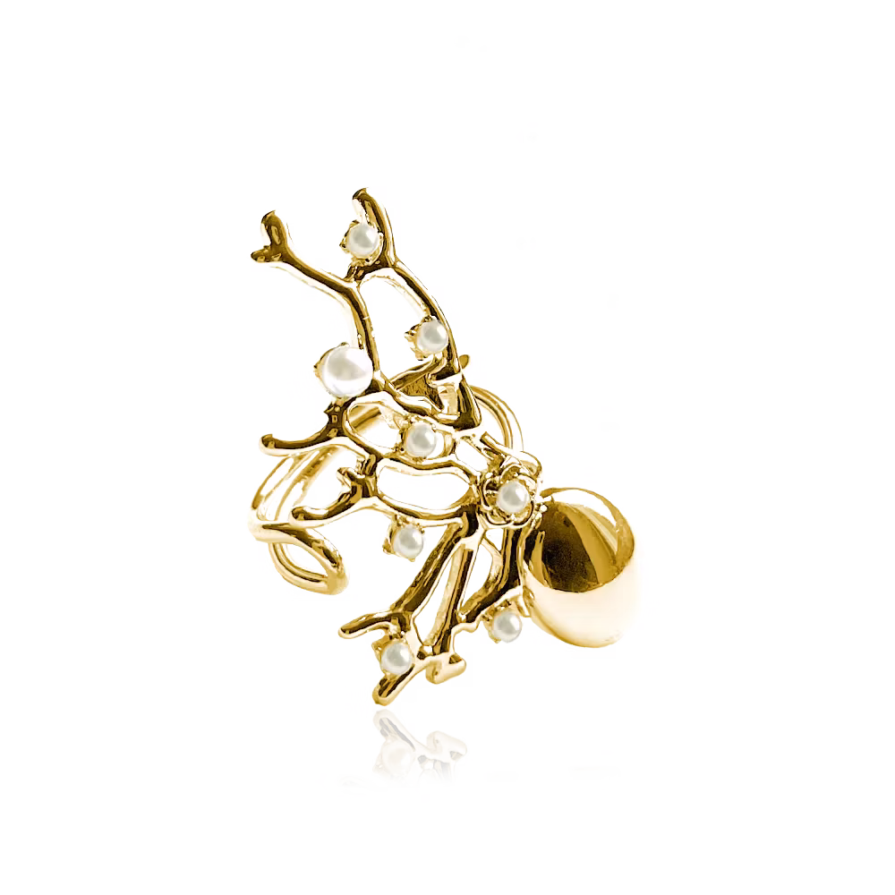Elegant designad stor guldfärgad ring som är dekorerad med vita pärlor. Ringen är gjord i mässing som är pläterad av 18k guld. Justerbar storlek så den passar de flesta.Smycket är nickel, kadmium och blyfri.