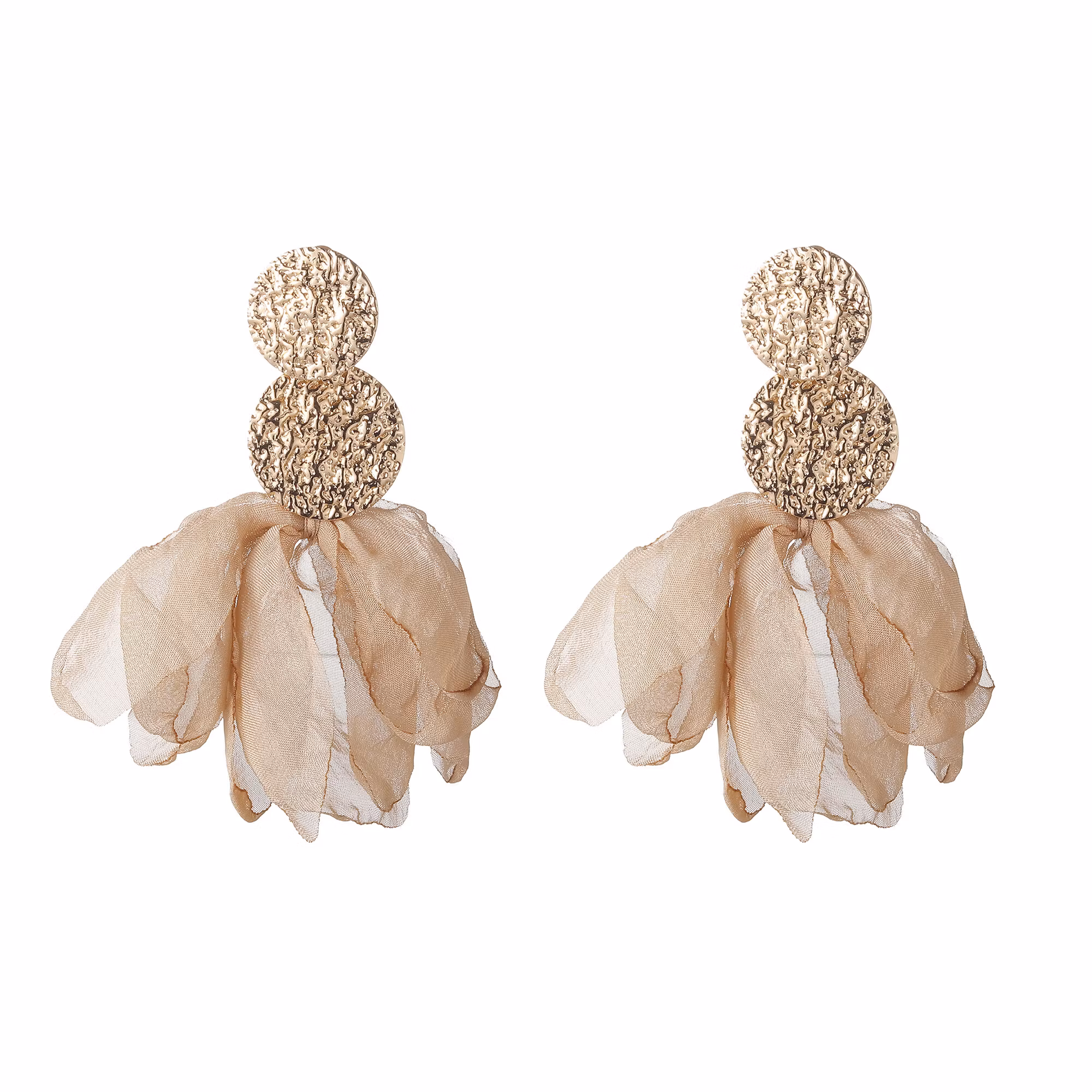 Varje örhänge är omsorgsfullt designat med ett beige tyg som formar sig som en blomma, vilket ger en feminin och lekfull touch. De två hamrade guldfärgade plattorna ger en sofistikerad kontrast och en lyxig känsla. Trots sin storlek sitter de bekvämt och lätt i örat, vilket gör dem perfekta för långa dagar och sena kvällar.