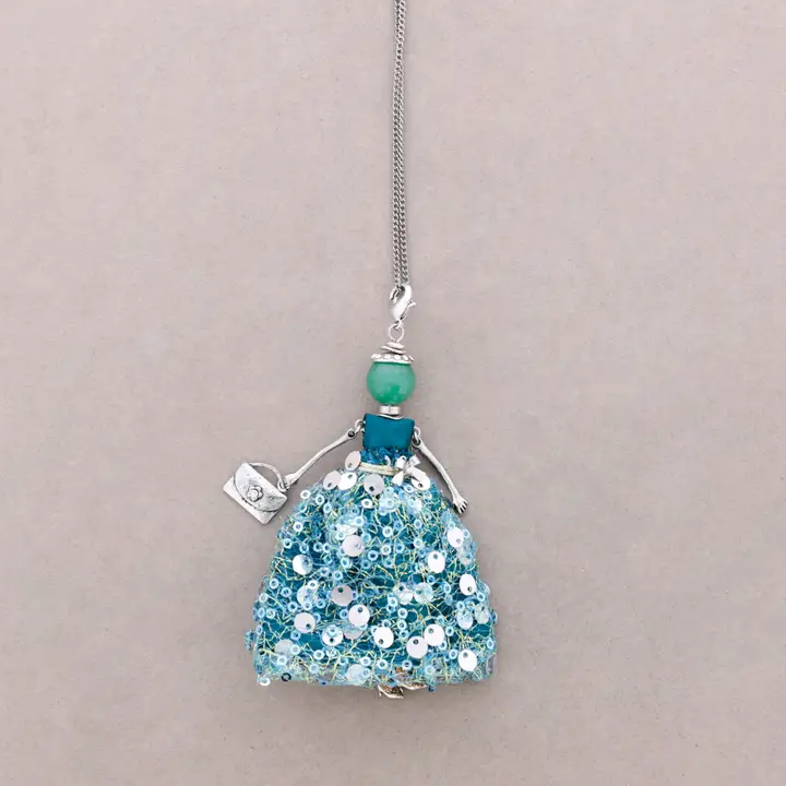 Halsbandets hänge föreställer en charmig modedocka, klädd i en gnistrande klänning av turkosa och silvriga paljetter. Dockans huvud är en stilren turkos pärla, vilket ger en extra touch av sofistikation. Den silvriga kedjan kompletterar looken och gör halsbandet till en fulländad accessoar för alla modemedvetna.