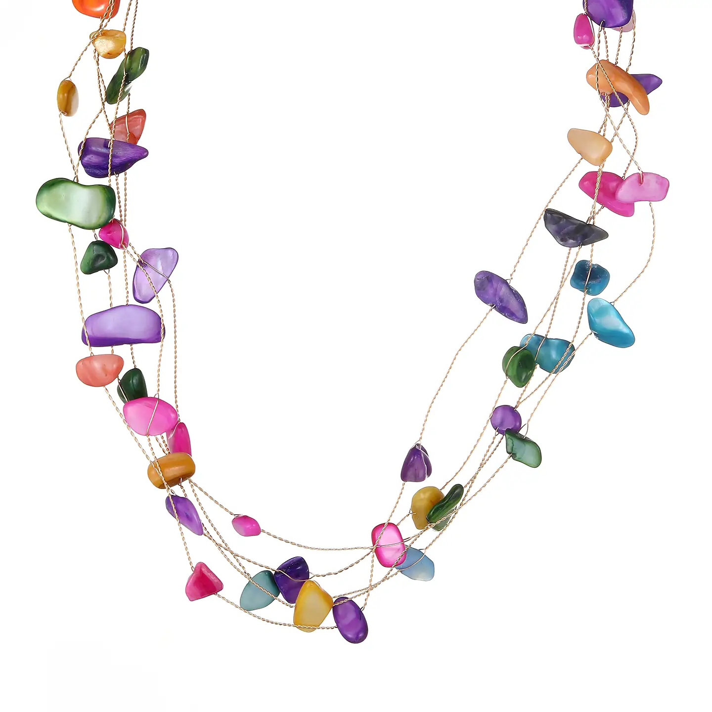 Flera rader av tunn tråd ger en illusion av svävande pärlor, vilket gör detta halsband till ett konstverk i sig. Den lekfulla mixen av färger fångar essensen av vår och sommar, vilket gör det till ett perfekt val för alla tillfällen – oavsett om du strosa längs stranden eller minglar på en sommarfest.