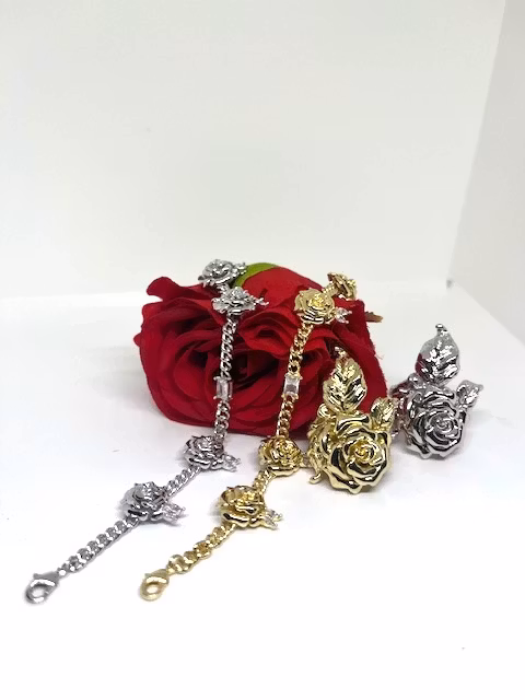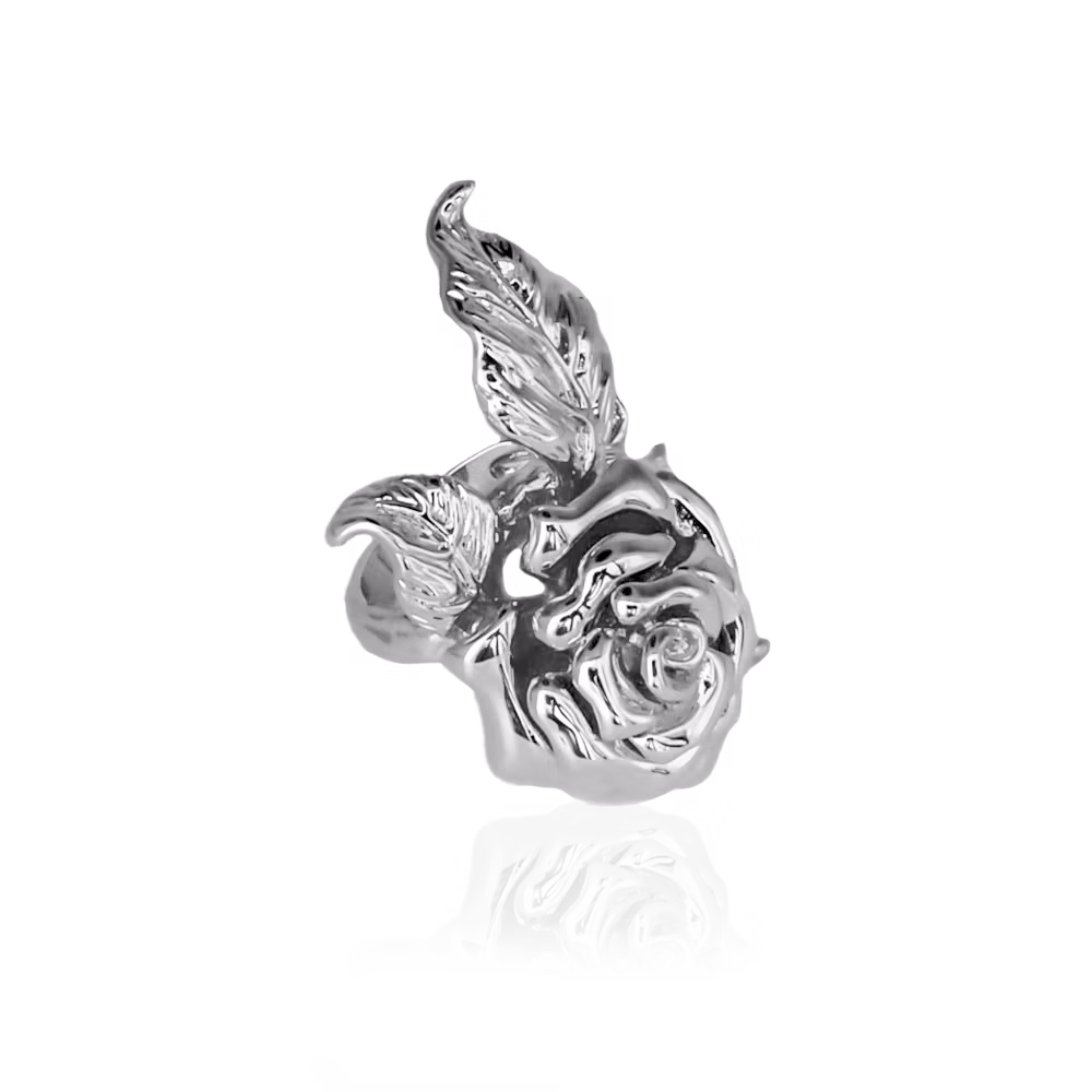Ring i form av en vacker ros och eleganta blad.