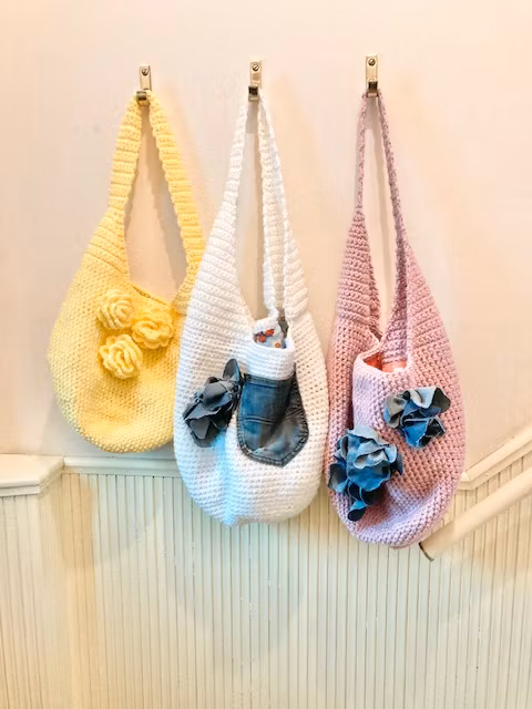 Rosa virkad väska med jeansdetaljer design Jemasmix