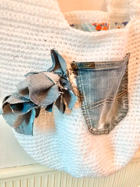 Trendig virkad större väska med våren 2023 stora trend jeansrosor. Väskan är virkad med dubbelt akryl garn för att bli stabil och dekorerad med jeanstyg en blomma och en ficka.. Tote bagen är fodrad med ett retro frotte tyg som ej är avtagbart. Väskan är handgjord och designad av Jemasmix by Lisbeth