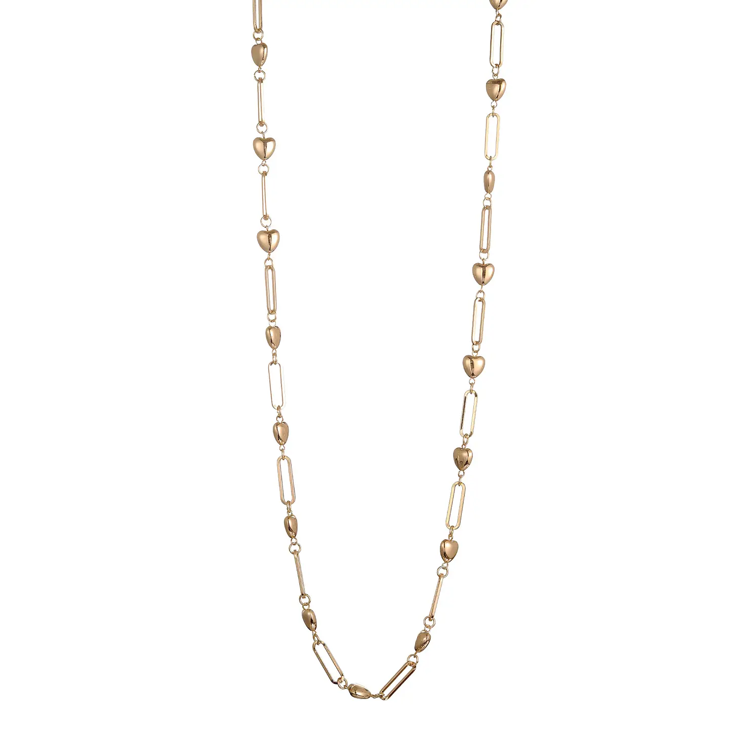 Trendigt långt halsband dekorerat med hjärtan, kulor och runda öglor i guldfärg! Ett smycke som passar lika fint till fest som till vardag!