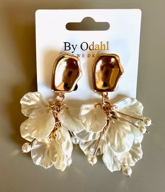 Låt dig glänsa och skina i dessa eleganta pärlemor skimrande örhängen. Örhänget består av en guldfärgad platt som sätts mot ditt öra. Sedan hänger det vita pärlemor skimrande löv och vita pärlor från plattan. Örhänget är i lätta och behagliga att bära. Designen på smycket passar i många sammanhang. Både till bröllop, stora fester samt enklare middagar. Ett klassiskt örhänge men ändå ett smycke som har den där extra wow känslan.