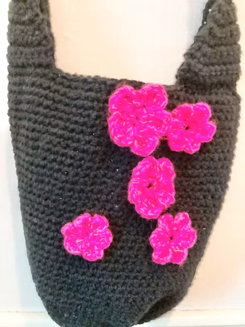 Väska virkad Svart med 5 Cerise Rosor - Jemasmix!