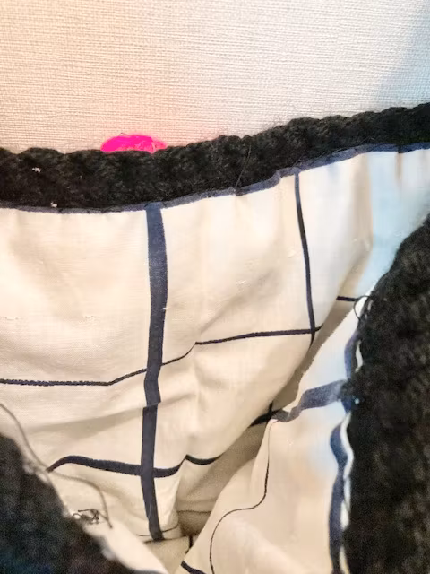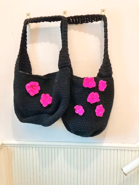 Vår väska är virkad med dubbla trådar av svart akryl för att totebagen ska bli stadig. Väskan är dekorerad med rosor som är virkade i cerise färgat reflexgarn.