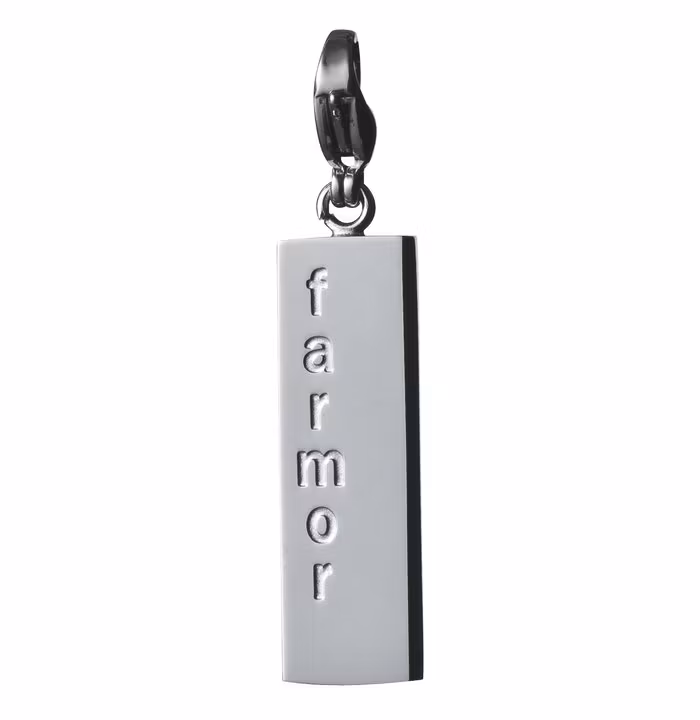 Graverad text på berlocken Älskad på ena sidan och Farmor på den andra sidan