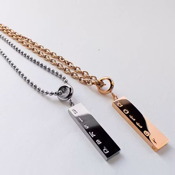 Stilren och snygg berlock till halsband med texten "älskad" graverat på ena sidan och "mamma" på den andra.